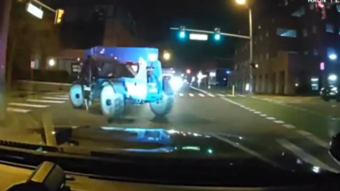 ANN ARBOR, Mich. (AAPD) – On 11/25/23 at approximately 6:45pm, officers responded to Forsyth Middle School (1564 Newport Road) for a report of a juvenile attempting to steal a construction vehicle. At 6:48pm officers located the stolen vehicle being driven southbound on Brooks Street near Pearl Street without any lights on. Multiple officers initiated a pursuit of the vehicle at speeds of 15 to 20mph with emergency lights and sirens on. During the pursuit, the driver of the stolen vehicle traveled through the Georgetown Boulevard neighborhood, striking approximately ten parked vehicles.