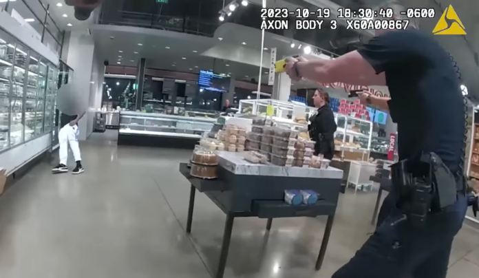 Denver, Colorado (DPD) — On Thursday, October 19, around 6:15 p.m., Denver Police officers were called to a Whole Foods store near Union Station for a report of someone brandishing a knife. Upon arrival, they found the man, 33-year-old Latif Robinson, with a 13-inch knife. Officers tried to negotiate with the suspect and offered him food, a place to stay, access to a hospital, money and a chance to charge his phone in an attempt to de-escalate the situation.